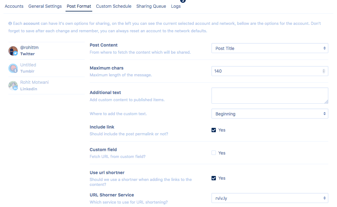 To use URL shortening service, we need to first enable URL shortener option from Post Format tab of Revive Social, for the account you want to enable shortening while sharing. To enable, Select Yes for option Use url shortener.