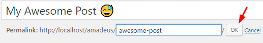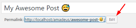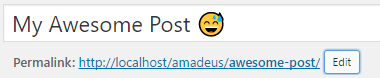 Paste the emoji you chose in your post title or description; whichever you wish and then publish your post. If you paste the emoji in the post title you will see that it also shows in the permalink, though this might not be an issue with most browsers— it is better that we remove this for those edge cases. Start by clicking "Edit" next to the permalink and then deleting the emoji and clicking "OK" to save: