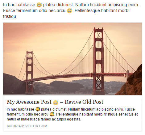 The reason this happens is that for the Facebook post content we used the website's post body, so in the preview, it would show your emojis in there as well as in the Facebook post content. The same would happen if you used the post title as the content and it had the emoji in it.