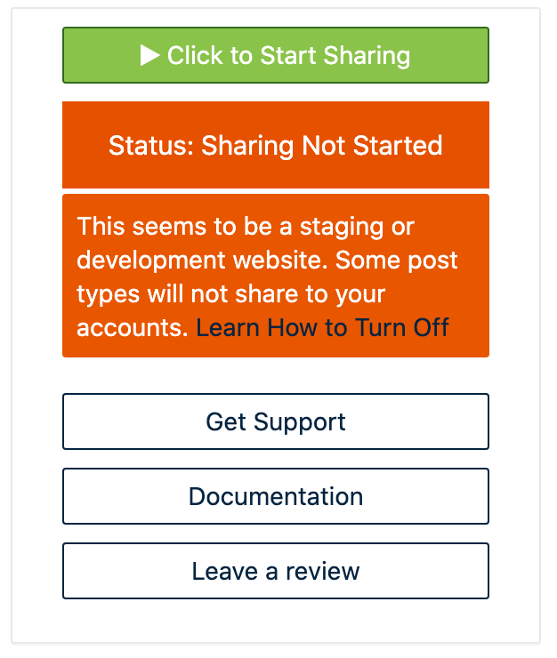 Revive Social has some checks and methods in place to help detect staging or development WordPress environments. When Revive Social detects such environments a notice is shown in the dashboard and the sharing process is skipped: