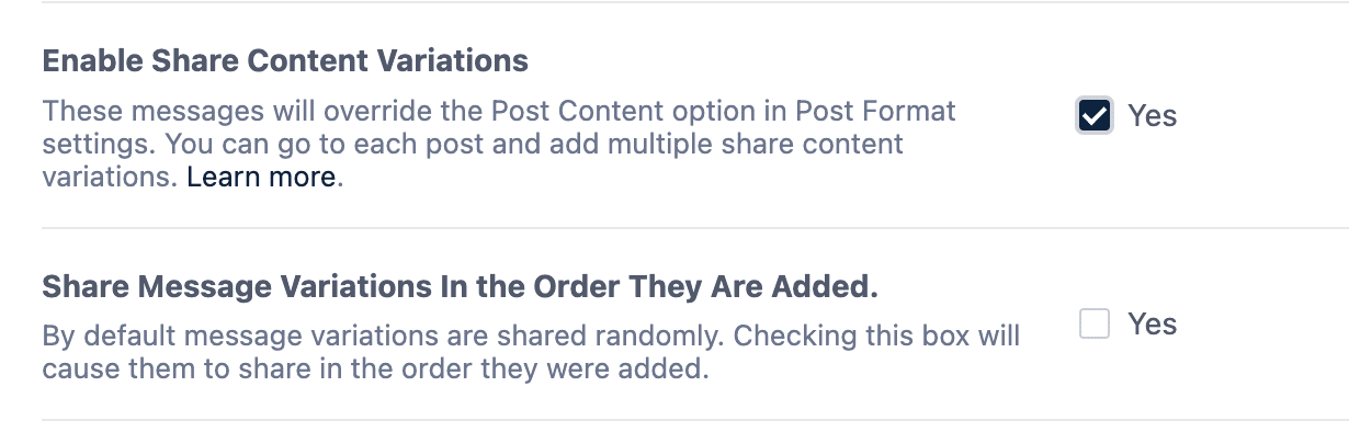 The plugin will automatically choose one out of the available custom messages (variations) to share to your social media accounts.