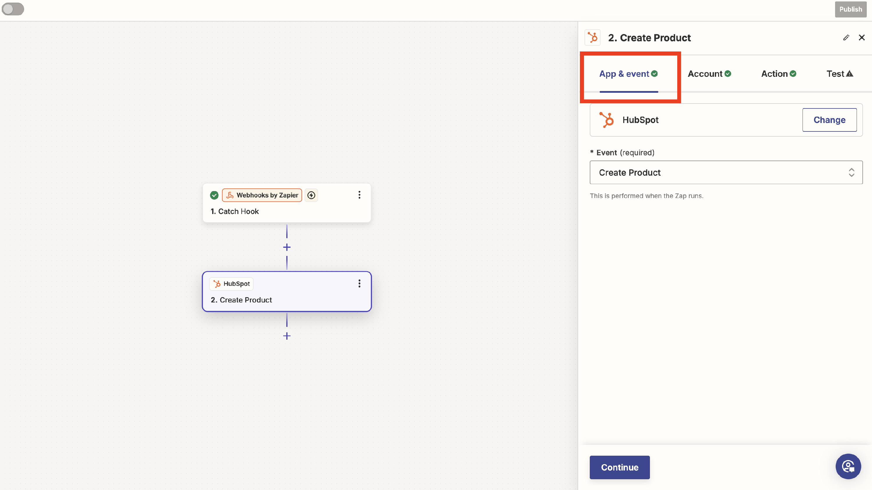 Choose "Catch Hook" as the trigger event, then click "Continue".