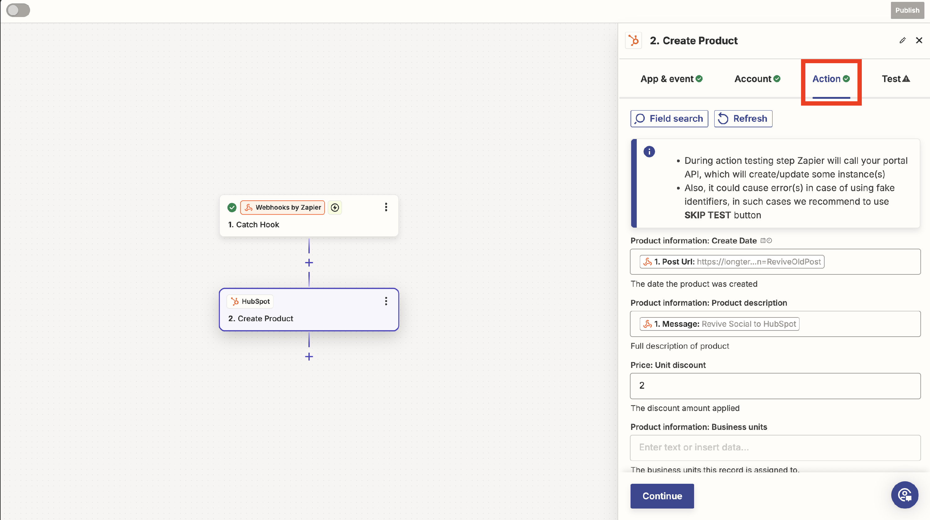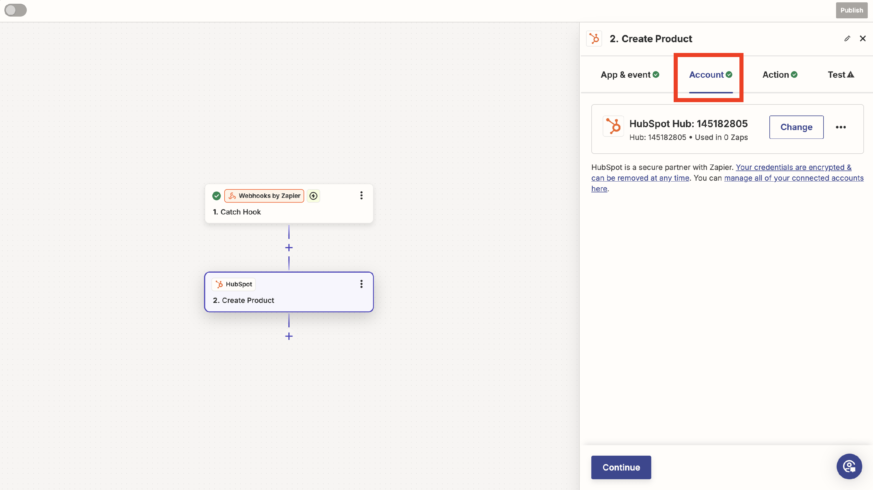 8. Click "Continue".Test your integration by clicking on Test Step.