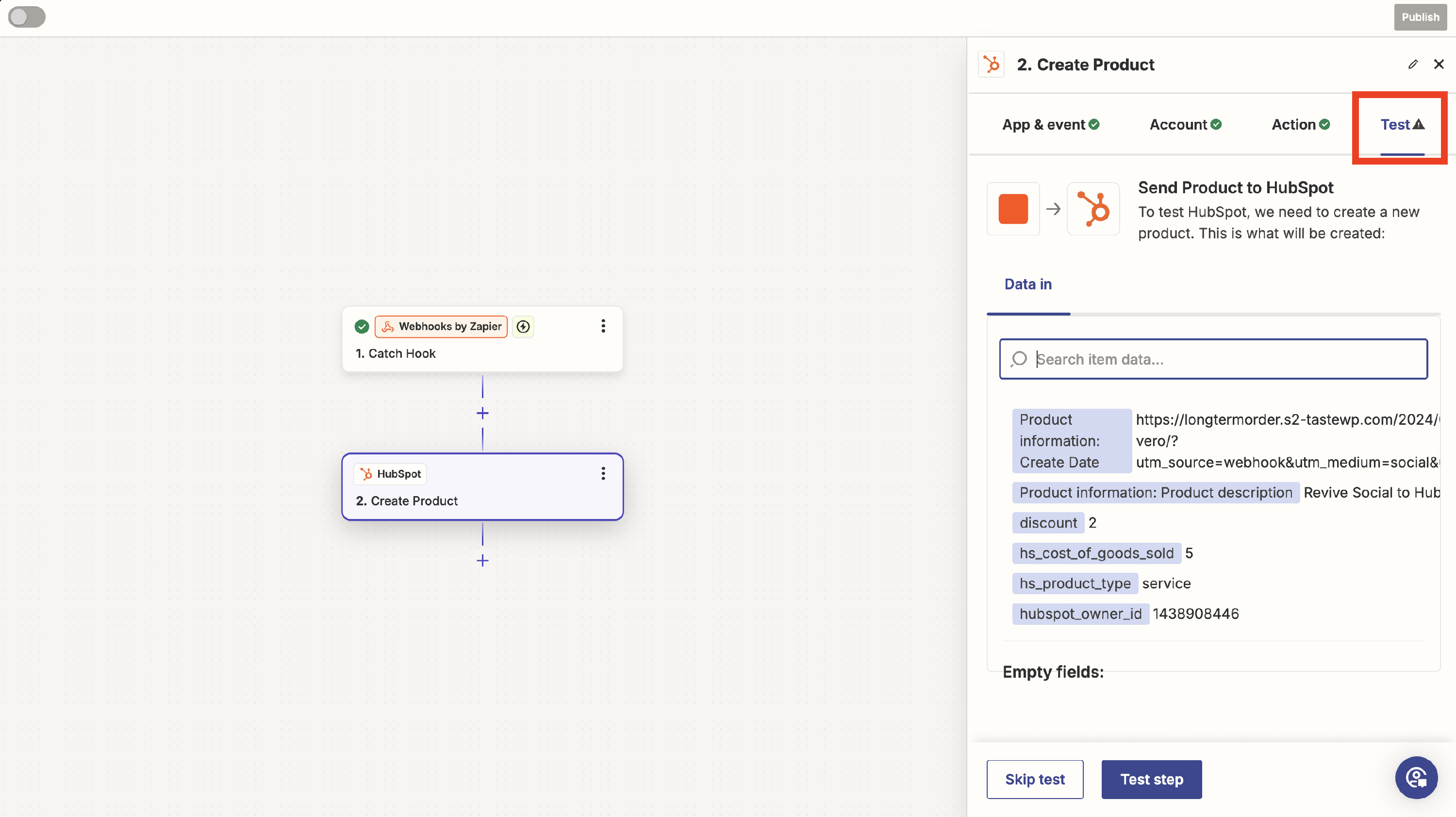 - Click on Webhook action and select the Test tab.