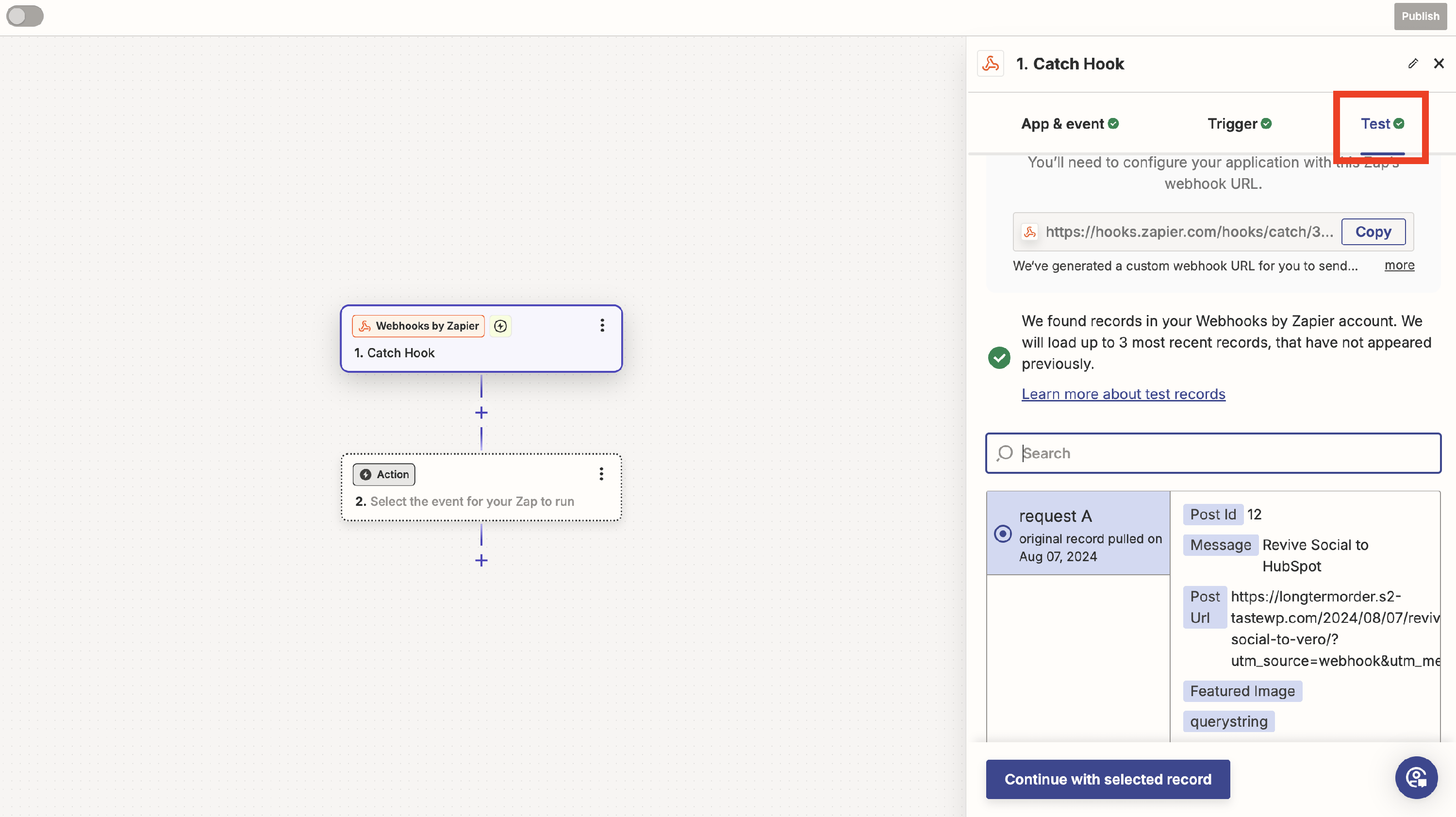 To achieve this, we need to send a test payload to Zapier. Thus, we will set up a Webhook account in our plugin and send a sample post to it.