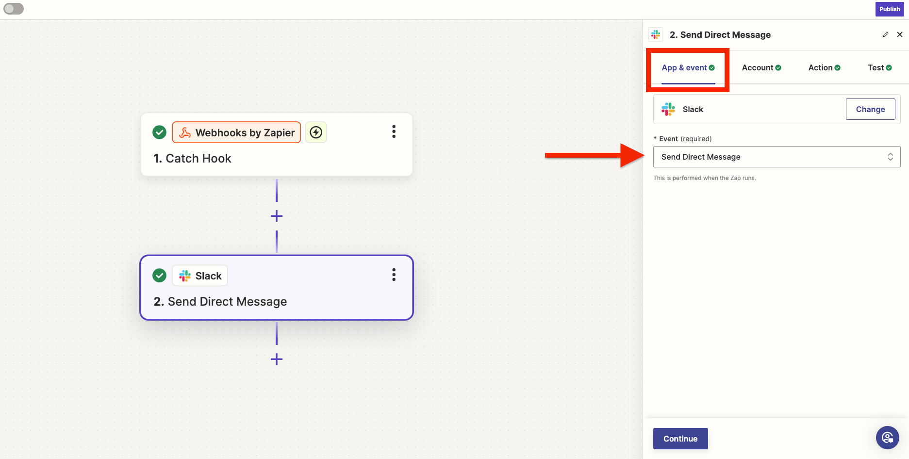 Choose "Catch Hook" as the trigger event, then click "Continue".