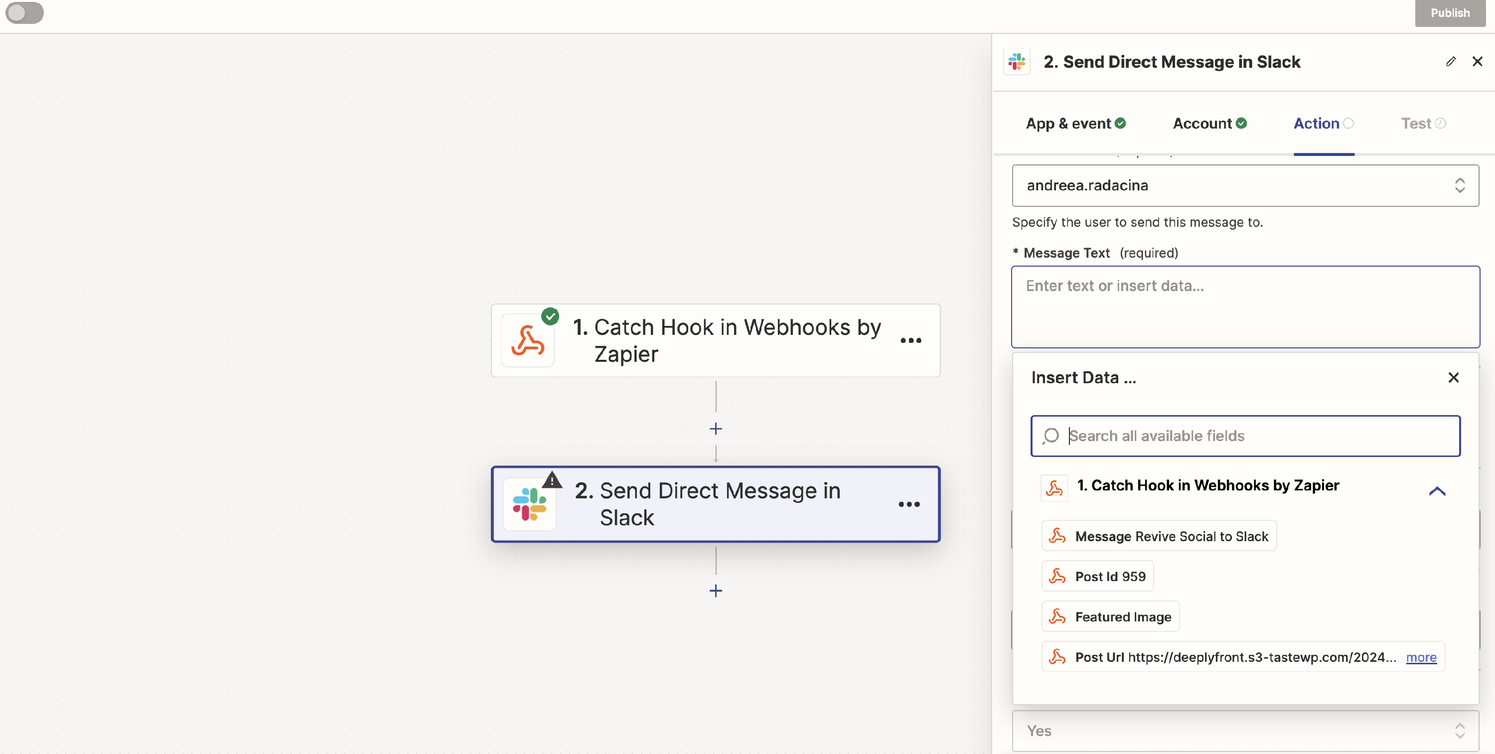 9. Fill the other fields with the data from the webhook. You should see a nice dropdown with the data from the post.