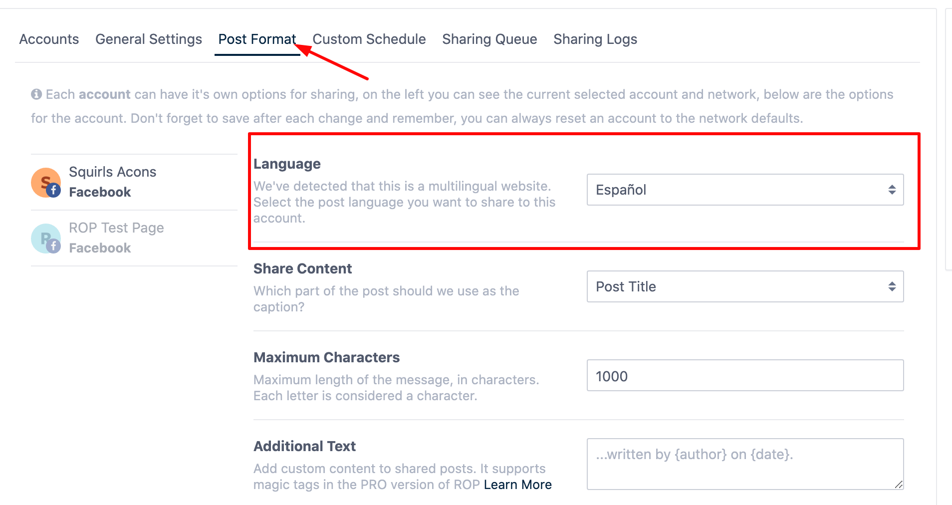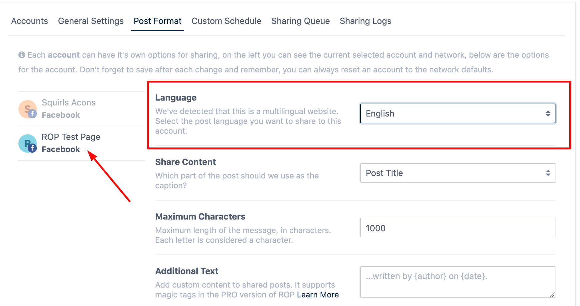 In our example above We're sharing posts with Spanish Translations to our Facebook page called Squirls Acons. We can have a different language sharing to our Facebook page called ROP Test Page if we want: