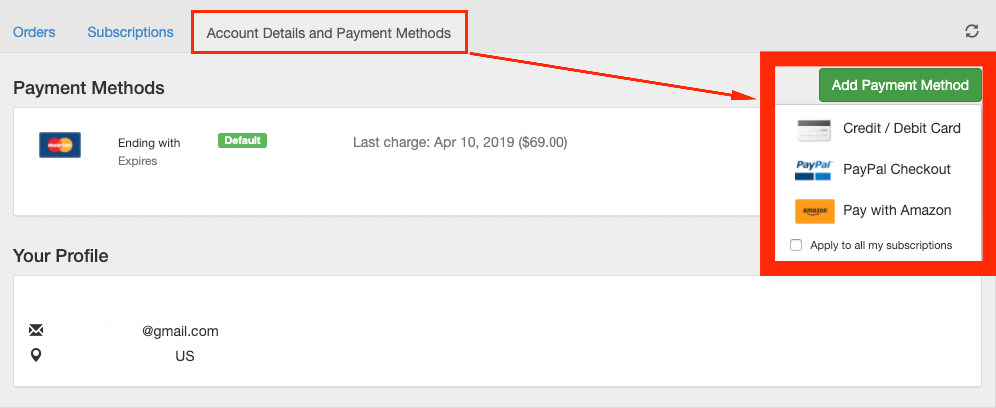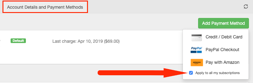 Click on the Account Details and Payment Methods tab to bring you to the page where you can either add a new payment method or update existing information.