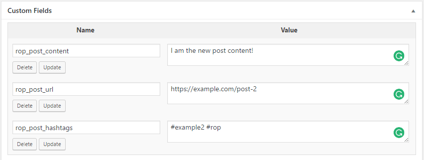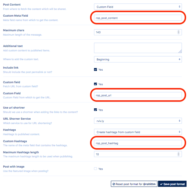 Go to WordPress Dashboard > Revive Social > Post Format and enter your custom fields into their respective areas: