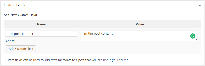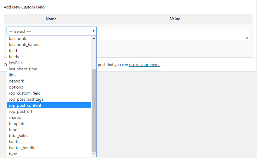 Under the Name field, enter the name of the custom field you want to create, in this case, the first one we will create is rop_post_content.