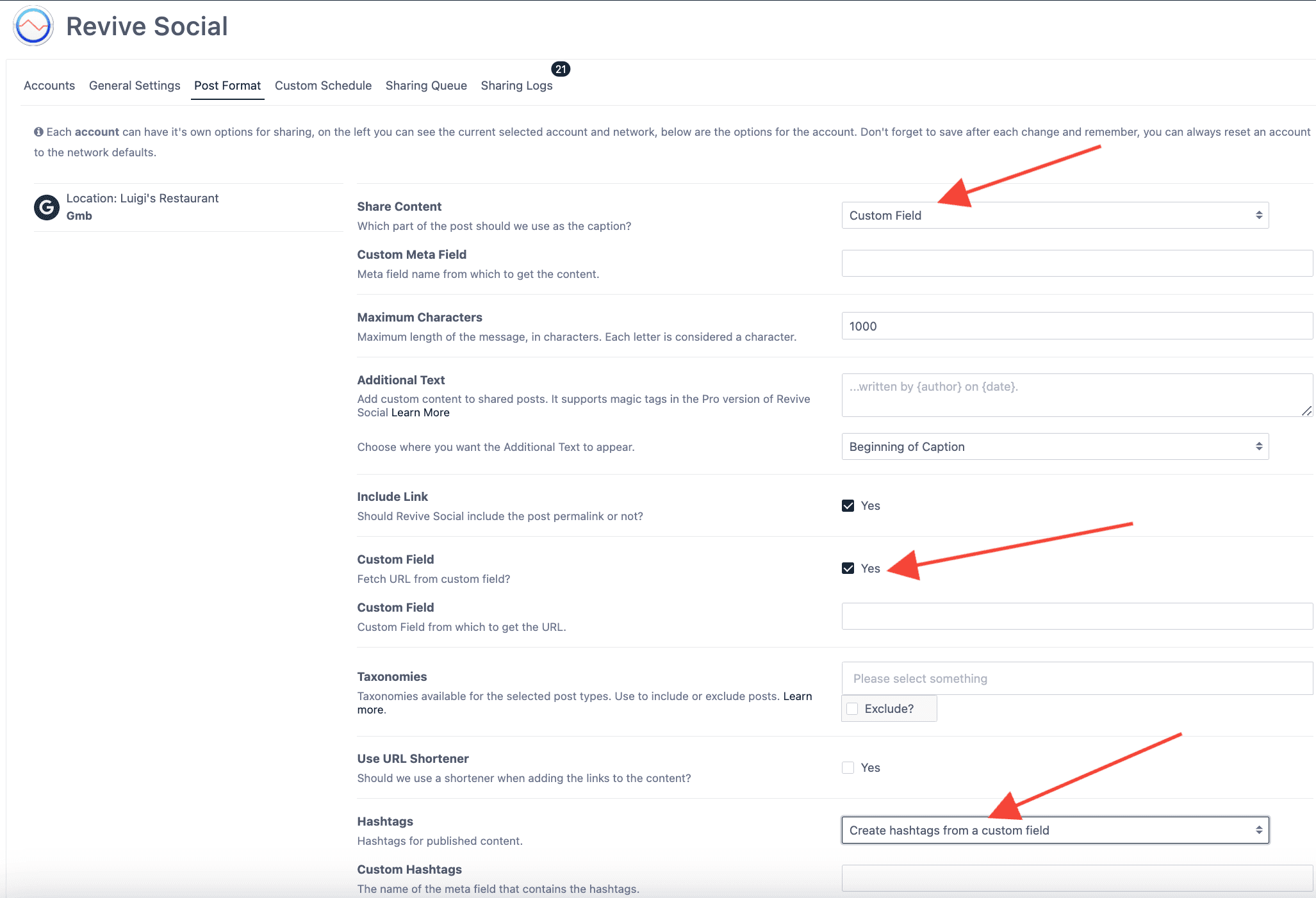How to use custom fields (Content + URL+hashtags) in Revive Social