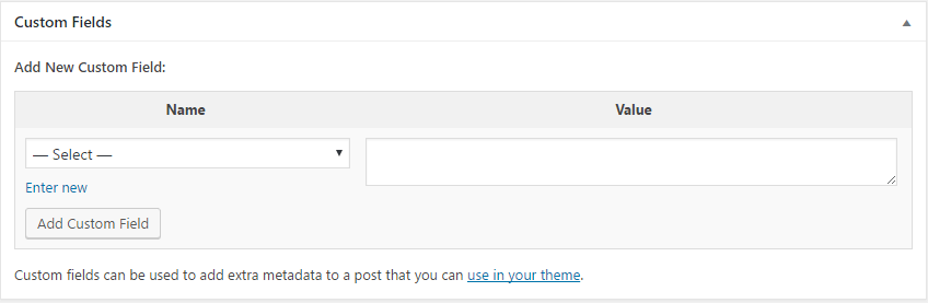 Now we are going to create another post, but this time we want the same custom fields but just with a different value. After creating your new post, scroll to the bottom of the page and this time instead of adding a new custom field we will select it from the drop-down menu: