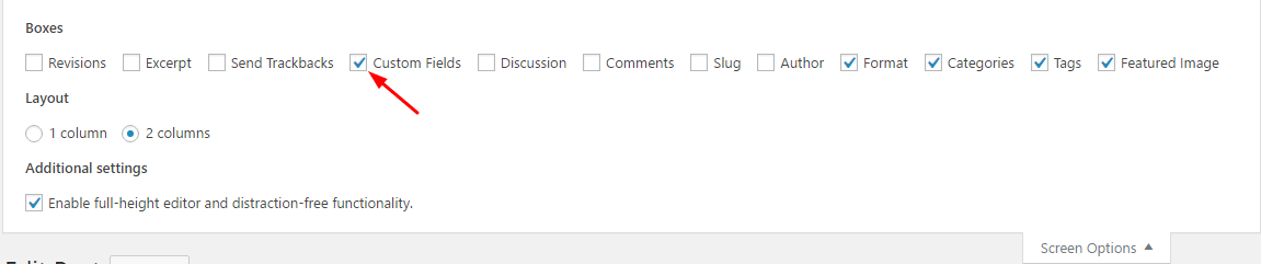 Start by going to your post and enable the custom fields option if it's not already enabled. To do so click Screen Options at the top and check the Custom fields option: